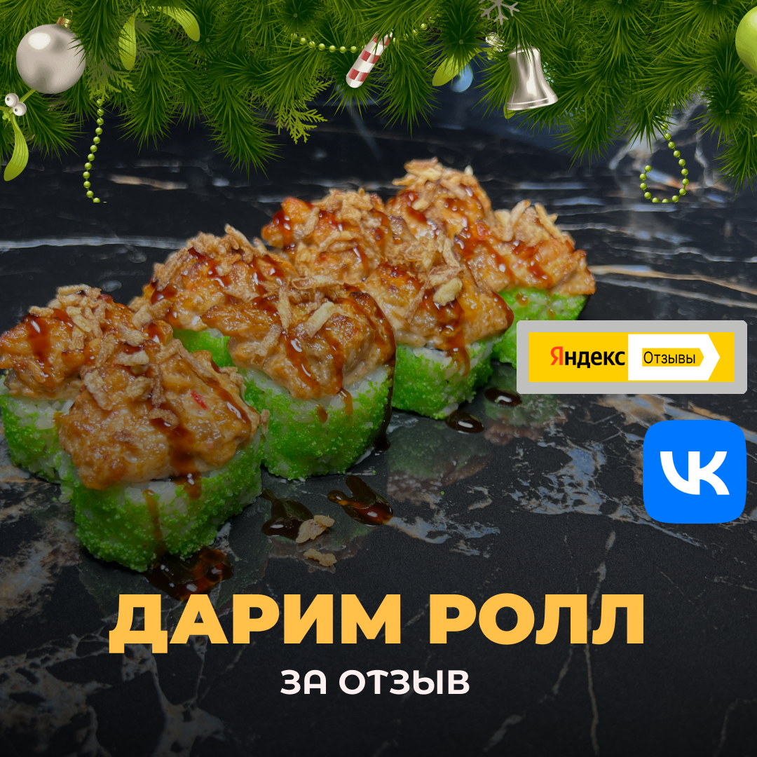 Любишь наши роллы? Тогда скажи об этом миру — и получи подарок 😎🍣 Что нужно сделать: 1️⃣ Оставь отзыв о нас — на Яндекс Картах 📍 — или в нашей группе VK (честно, как есть — нам важно мнение) 2️⃣ При следующем заказе: 👉 напиши оператору / в комментарии к заказу «ОТЗЫВ ОСТАВИЛ» или покажи скрин отзыва 🎁 Мы подарим тебе РОЛЛ БЕСПЛАТНО